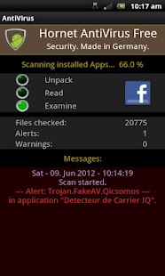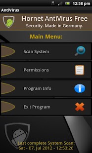 - Actualization of malware-definitions and of the program at regular intervals using the update functionality of "Google Play". (Please activate "Allow automatic updating" for Hornet AntiVirus.)